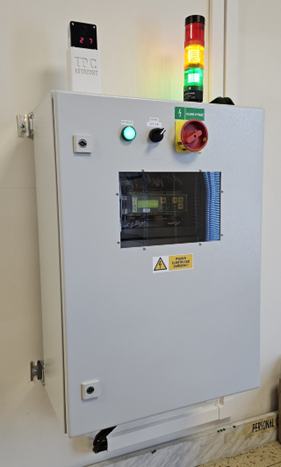 Využili jsme kompaktní řídicí jednotku AMIT AMiNi4DW2, která zajišťuje řízení celého teplotního režimu uvnitř rozvaděče. Chlazení je realizováno přívodem stlačeného vzduchu řízeného elektroventilem. O topení se stará těleso Rittal, které je řízeno dle aktuální teploty. Všechny stavy jsou sledovány a alarmy odesílány prostřednictvím GSM komunikace formou SMS. Systém lze zároveň sledovat i vzdáleně přes webové rozhraní.
