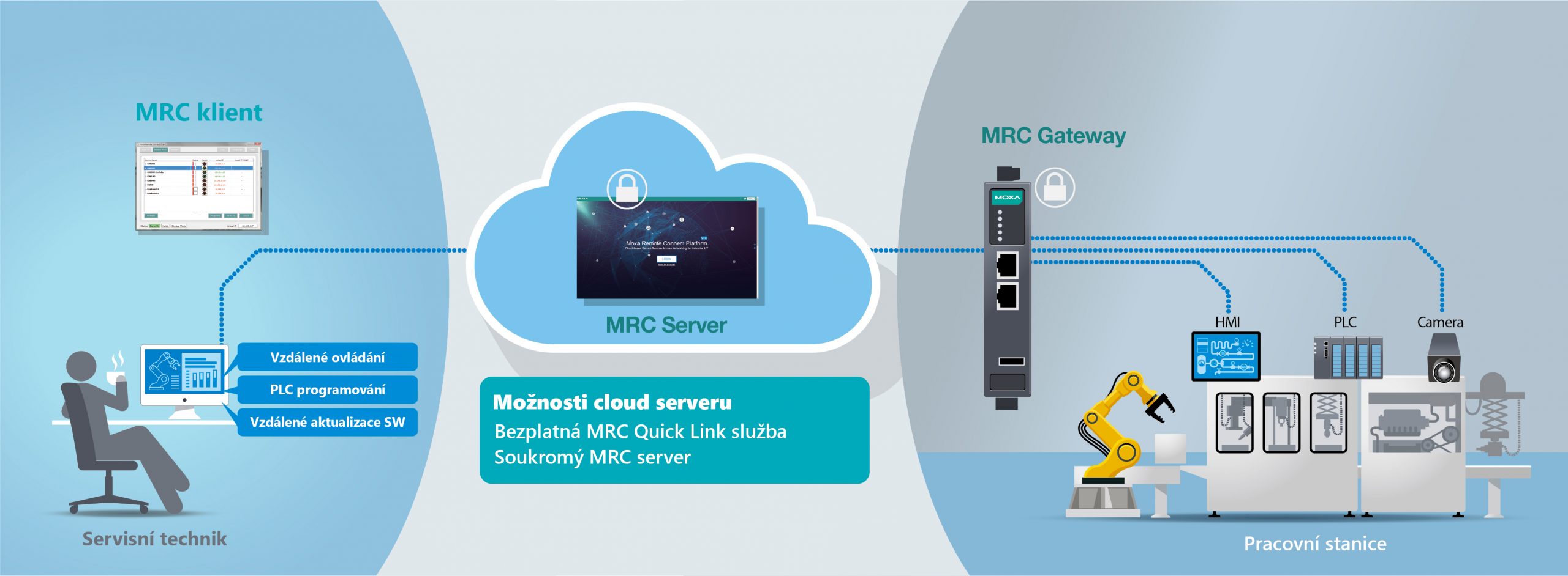 Jedná se o snadný vzdálený přístup k vaším strojům (PLC, HMI) a automatizační struktuře, který vám pomůže snížit nutnost servisních návštěv na místě, zlepší dostupnost služeb, zvýší produktivitu a díky toho ušetří čás a další náklady. Řešení Moxa Remote Connect (MRC) a MRC Quick Line Service zaručují novou úroveň zabezpečení, snadného používání a flexibility v rámci vzdáleného přístupu.